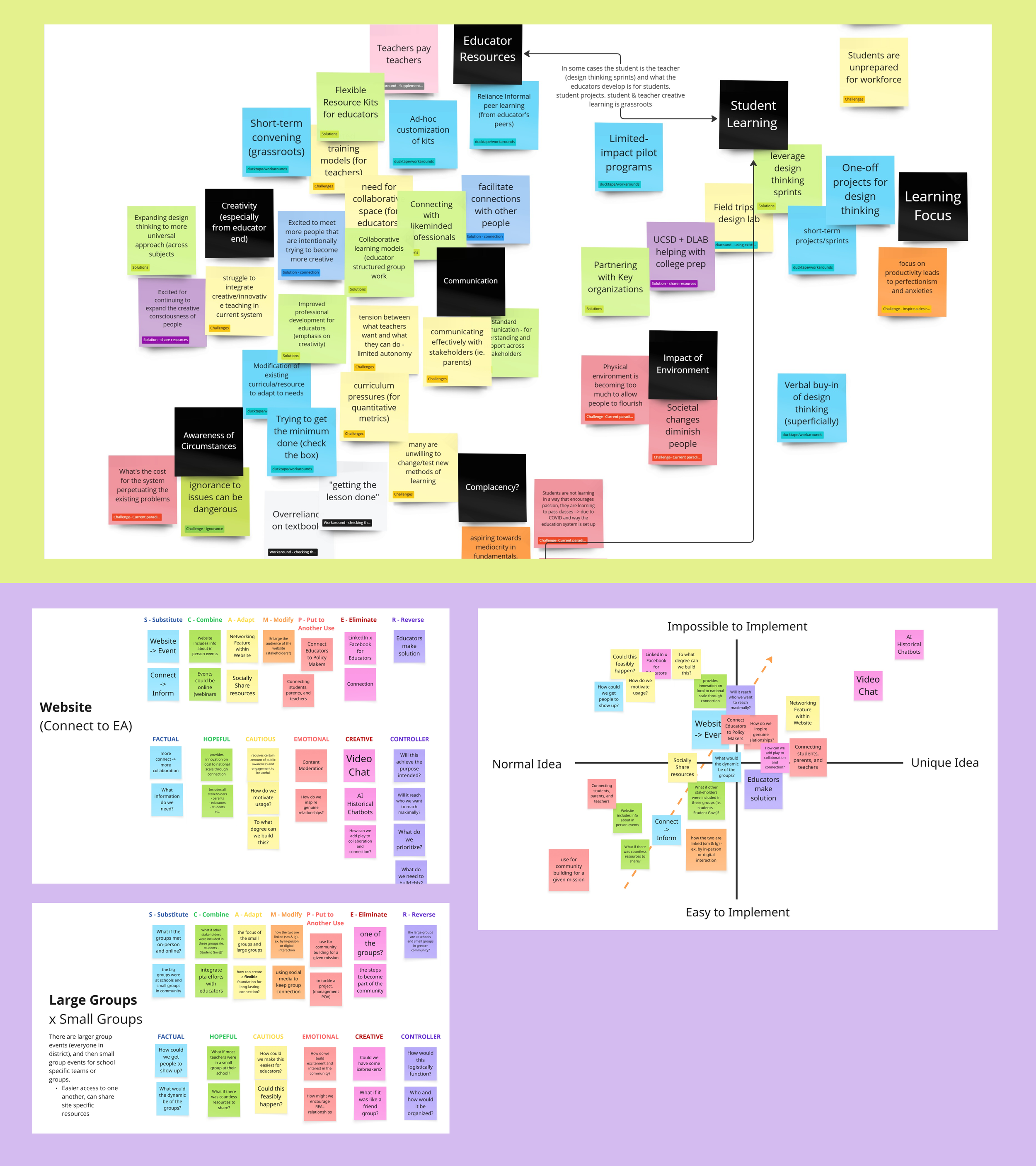 Our process was focused on listening. We conducted empathy mapping with educators and students, interviewed teachers, gathered insights from the CAYS Conference, and worked closely with the Educators Alliance. Curriculum reform is slow and deeply political, leaving a widening gap between what schools teach and what students need. Creativity is consistently undervalued, and neither teachers nor students have what they need to bridge that gap. Teachers want to be creative and support their students rather than teach to test, but they're held back by limited tools, time, and institutional support. Students, meanwhile, are craving hands-on, relevant learning experiences that give them real agency over their education and prepare them for the world beyond the classroom. Across all of our research, the message was clear: teachers don’t need more pressure. They need safe, trusted spaces to collaborate.