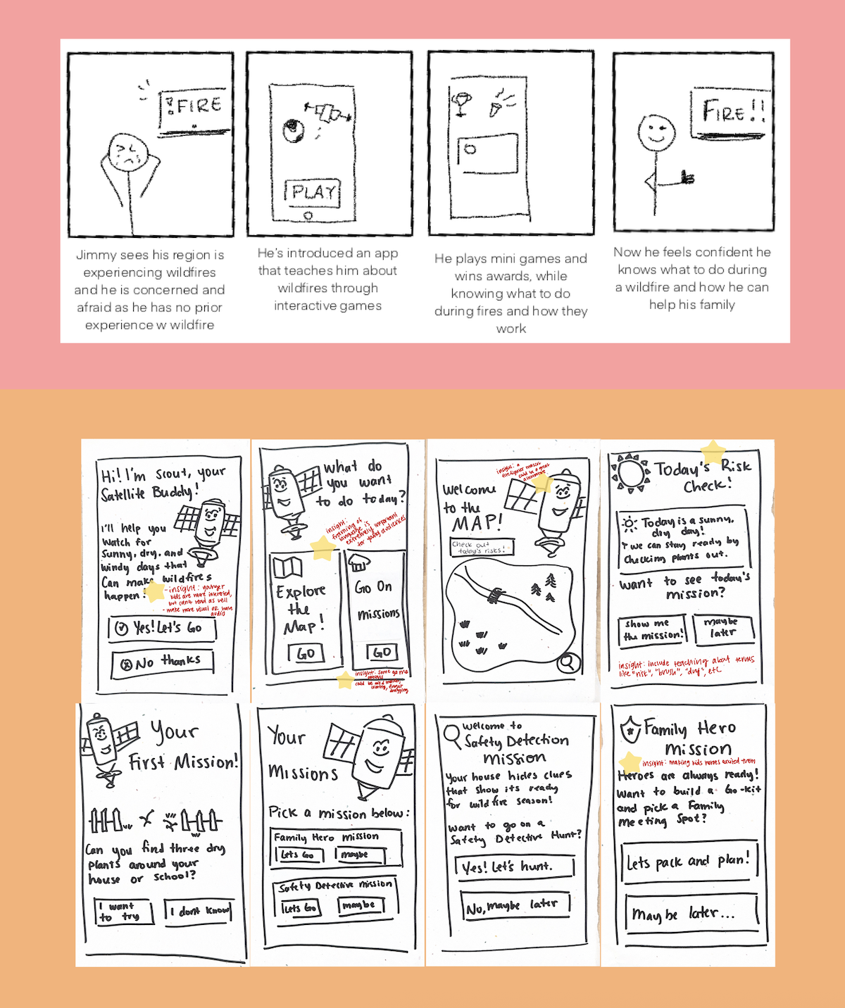 Problem Statement: How might we empower children in grades k-3 to understand, engage with, and remember wildfire preparedness, while also serving as messengers for spreading awareness and building knowledge within their families?