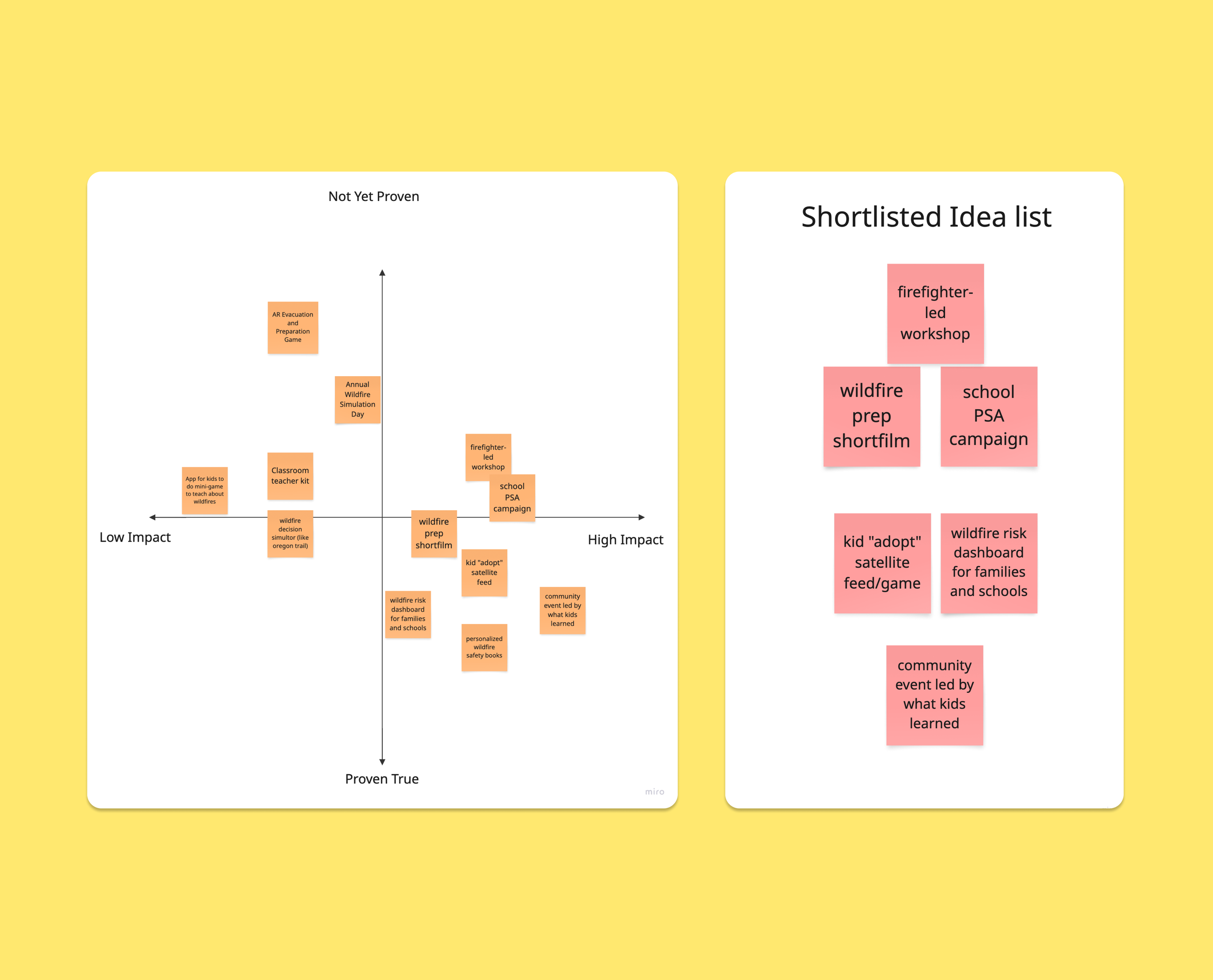 To evaluate our ideas, we used an assumptions chart to map potential solutions by impact and research backing, then shortlisted our top concepts and organized them across three stages of the educational process: in-school assemblies, at-home family games, and student-led community education events. We ultimately settled on gamified learning, supported by research showing it significantly enhances both engagement and knowledge retention in young audiences. Children proved to be an especially strong target for this approach — studies show they are more malleable, curious, and retain information more precisely than adults, confirming that an educational intervention would be most effective at this age. Beyond just reaching kids, we also recognized that children act as conduits into their households, bringing what they learn back to their families and influencing real behavioral change. Just as parents shape children, children shape their parents, meaning that teaching kids about wildfire preparedness can directly improve how their families prepare as well.
