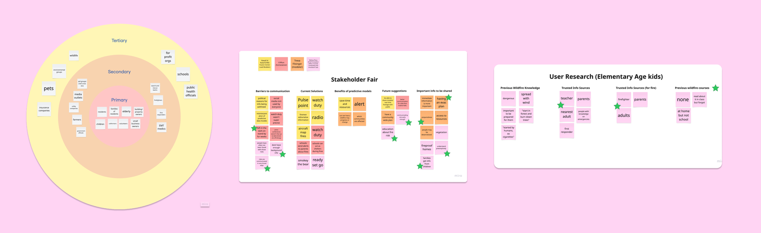 Getting to the Problem: Our research process began by identifying potential audiences: residents, the elderly, and children. We then began to narrow our focus through a series of stakeholder interviews. We spoke with four stakeholders, including three affiliated with WiFire and one homeowner directly impacted by the Palisades fires, uncovering key themes around barriers to communication, existing solutions, and opportunities for improvement. Three findings stood out: a widespread lack of wildfire preparedness, the outsized role children can play as communication channels within their households, and the importance of understanding risks before disaster strikes. These insights pointed us toward children as our primary audience, which we validated through user research with five elementary-aged kids. Those conversations revealed that schools largely leave children underprepared for wildfires, that kids look to parents, teachers, and officials as trusted information sources, and that most had little foundational knowledge about fire at all. From there, we defined our target audience as children in grades K–3 across California.