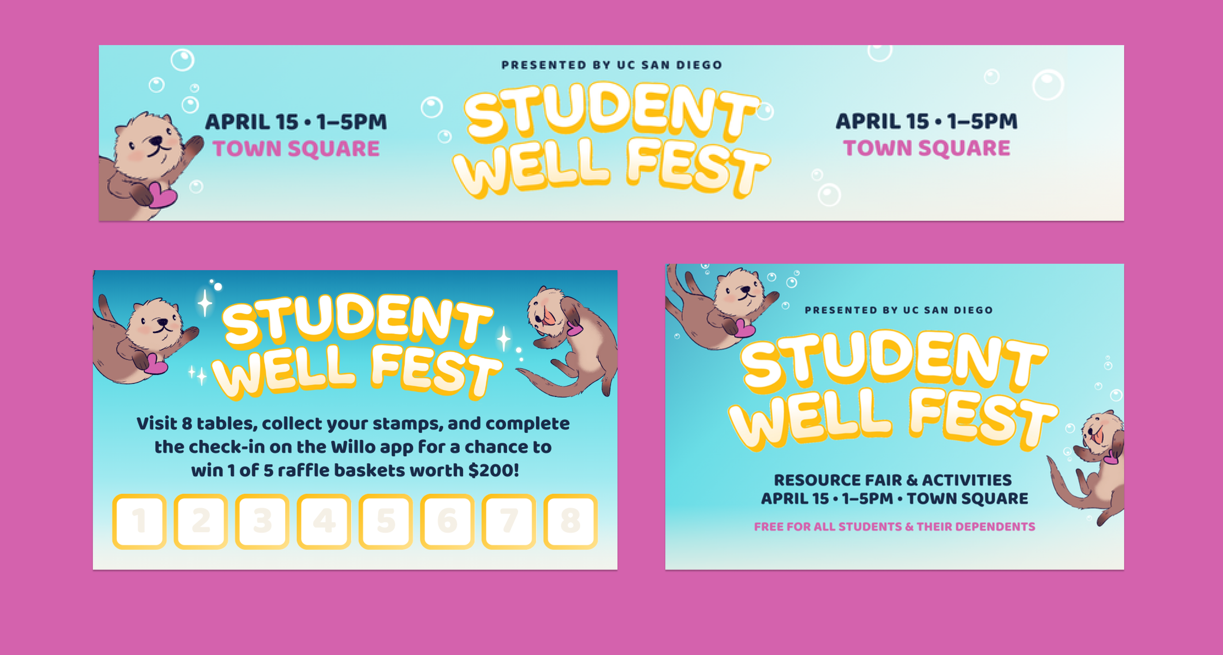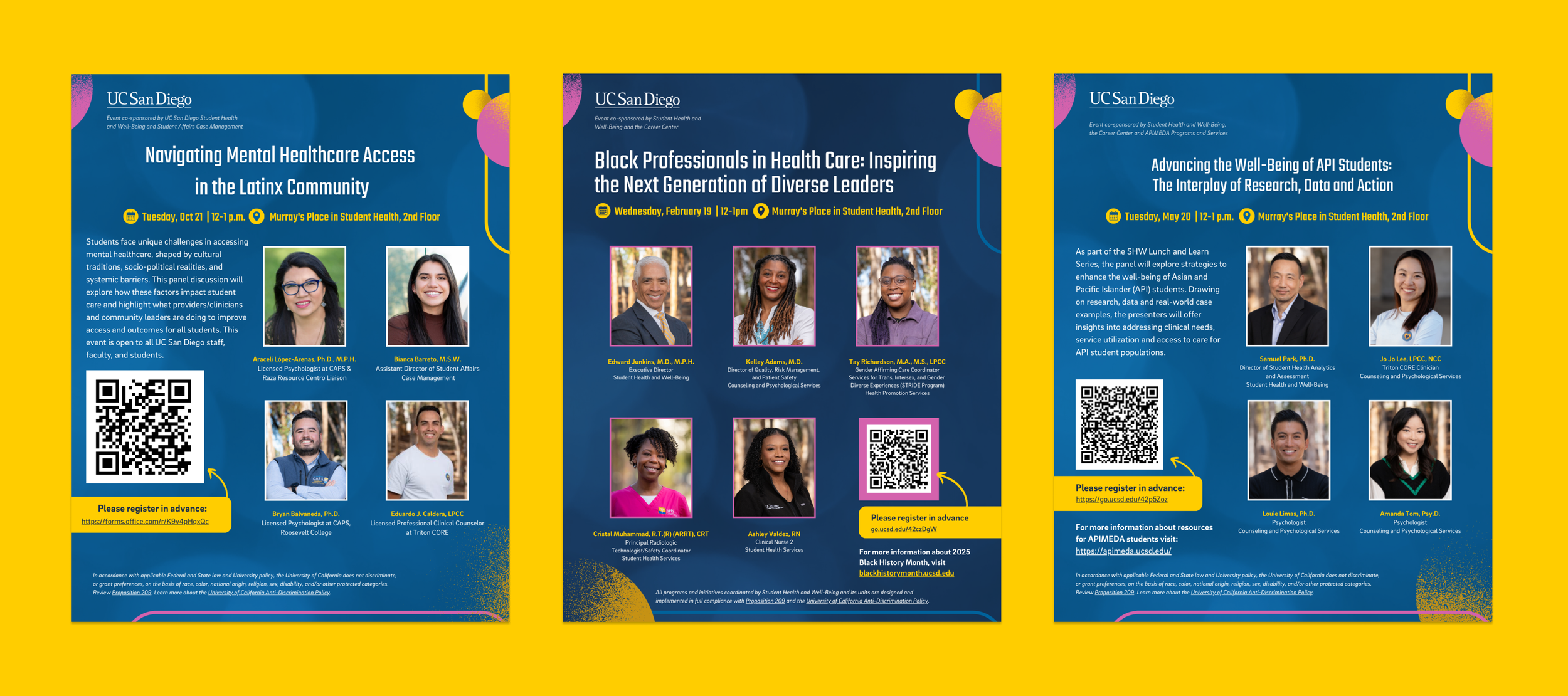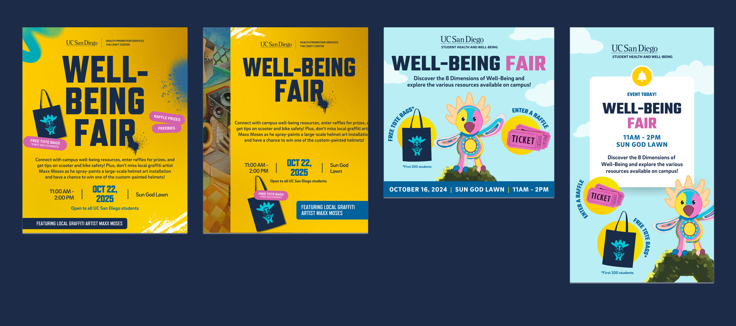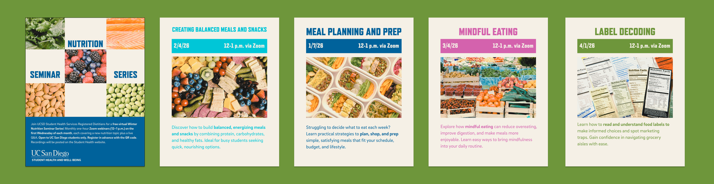 Brief: As a Marketing & Design Assistant for UCSD Student Health and Well-Being, I created graphics across Instagram, email newsletters, and digital campus displays — all designed within UCSD's visual branding standards.