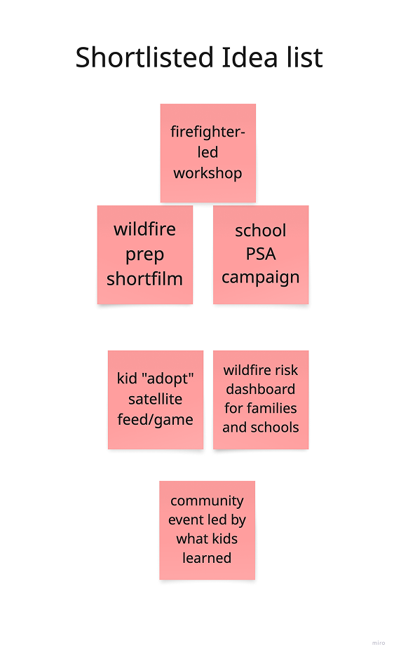 We then shortlisted our top ideas and sectioned them into different stages of the educational process (in-school assemblies, at-home family games, student led community education events)